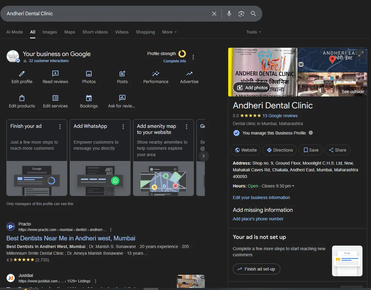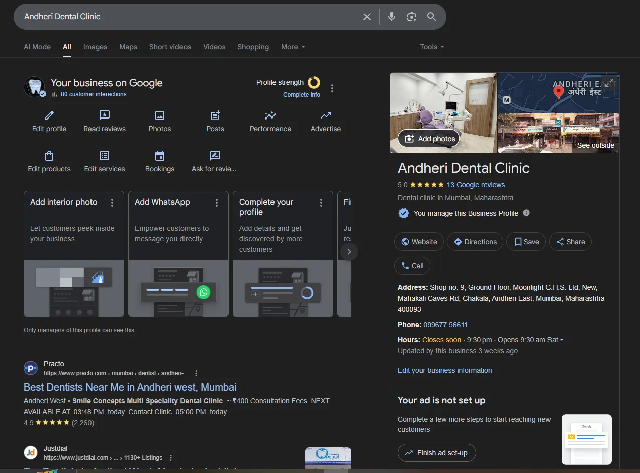 Complete Google My Business optimization for a dental clinic, improving local search visibility and patient engagement. Enhanced profile with professional photos, accurate business information, and strategic keyword optimization.