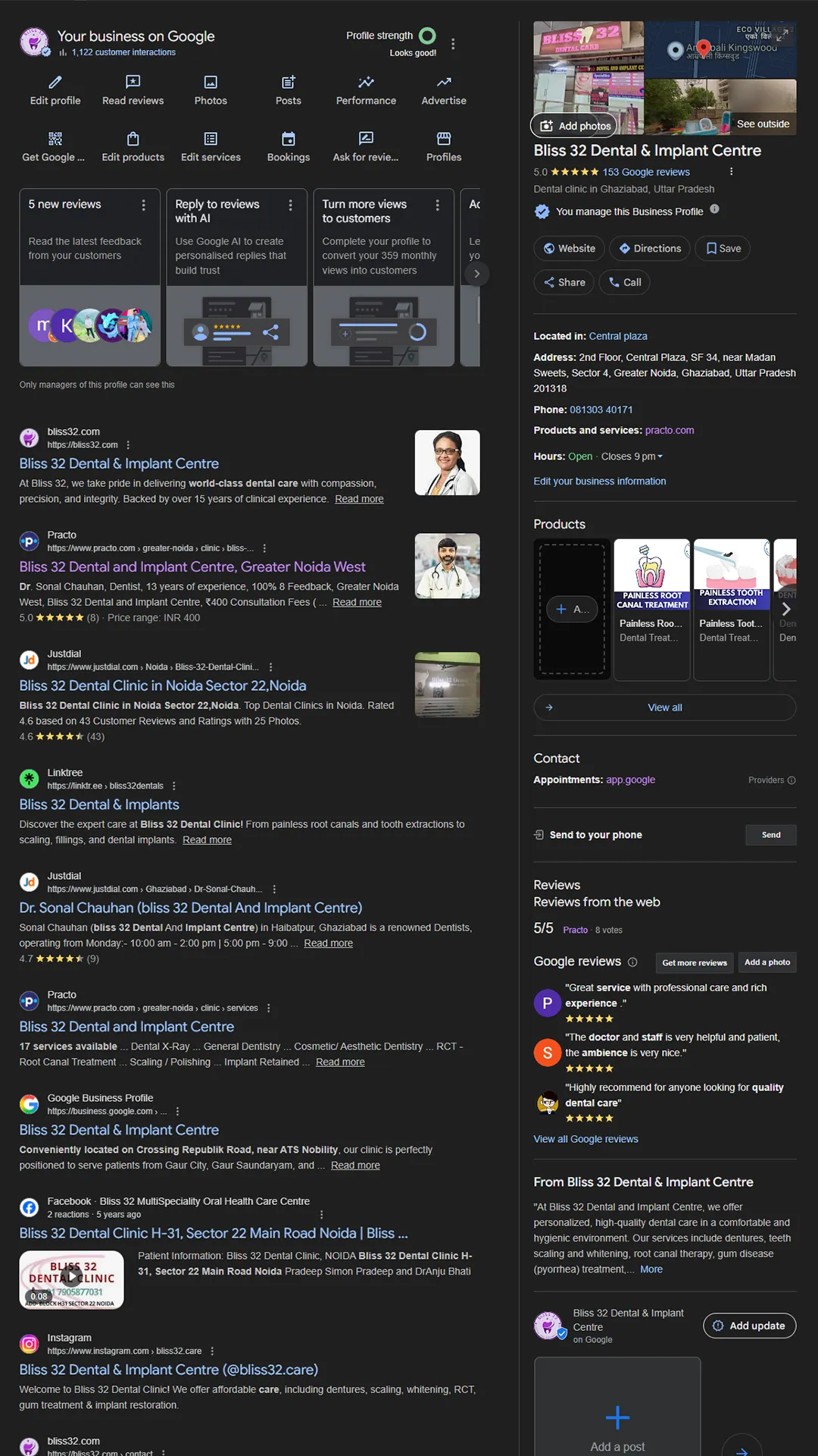 Complete Google My Business setup and optimization for a premium dental clinic in Greater Noida. Improved local search visibility, patient trust, and appointment bookings through professional branding, keyword-optimized content, and consistent profile updates.
